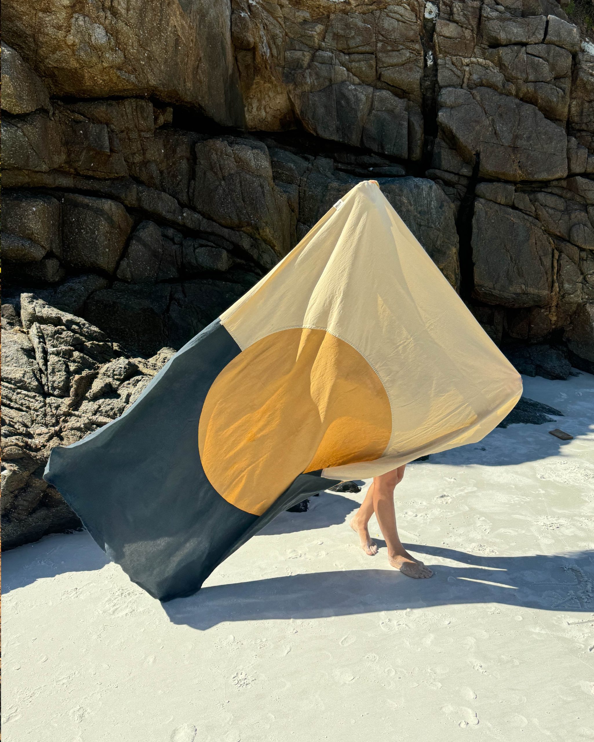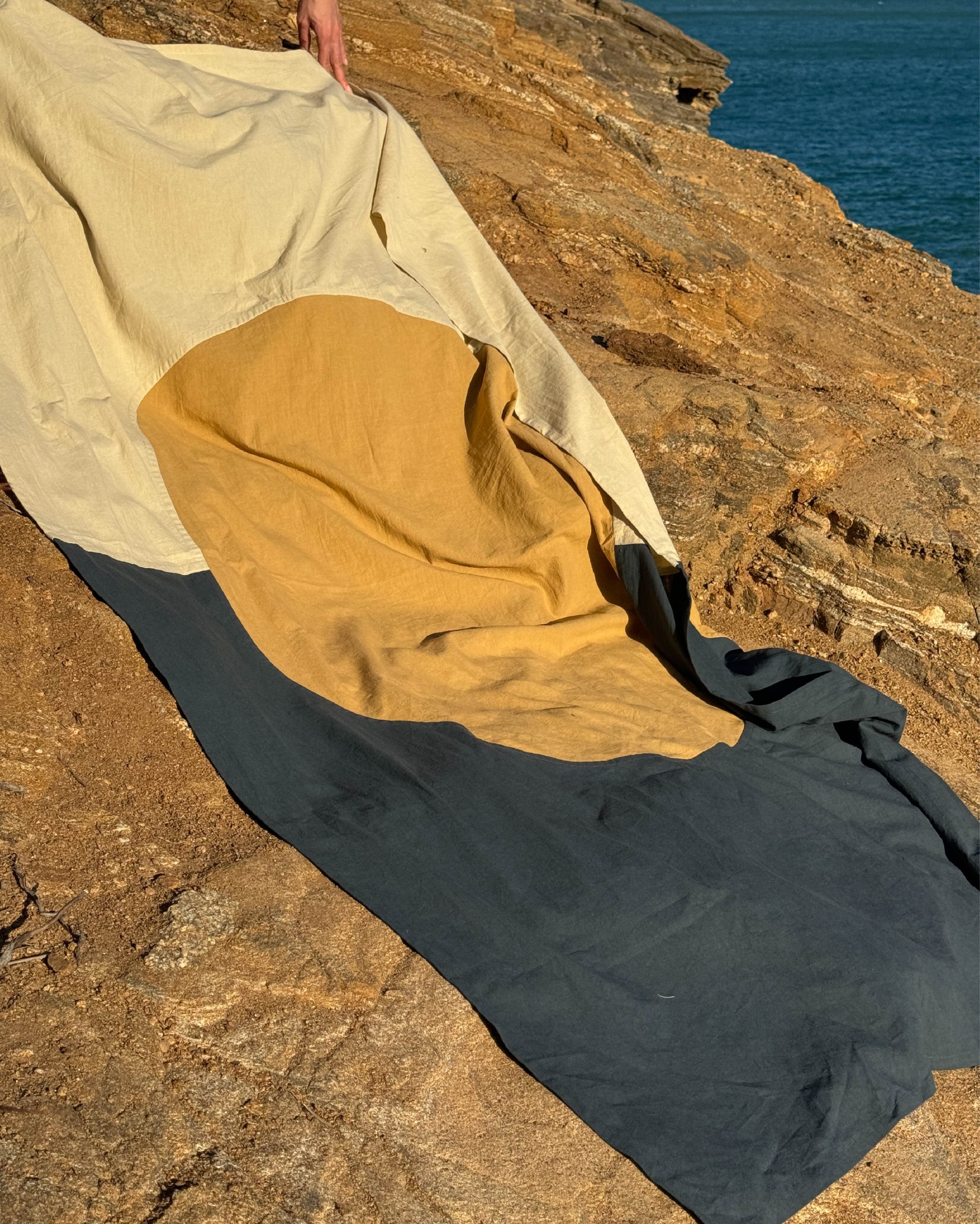 Pensada para usar de mil maneras: extendida en la playa, vistiendo una mesa, al pie de la cama, decorando una pared o cubriendo el sillón. Pieza versátil, nacida de procesos lentos y cuidados.